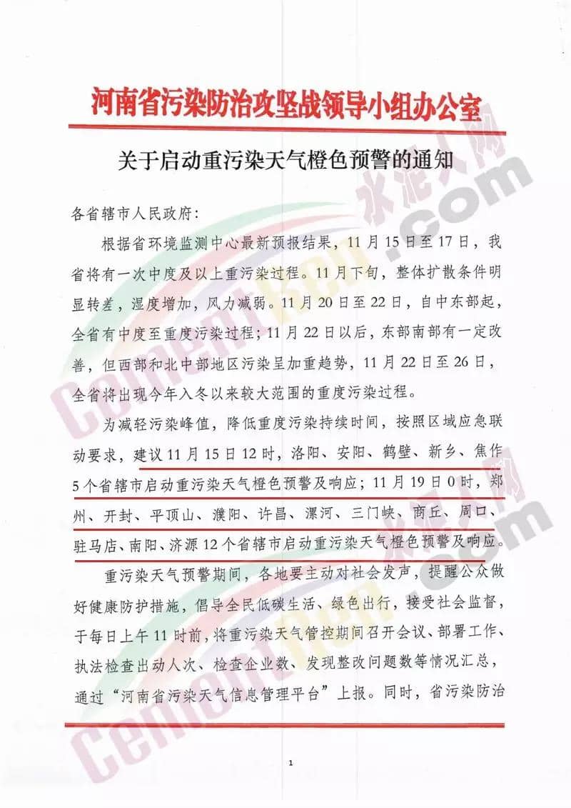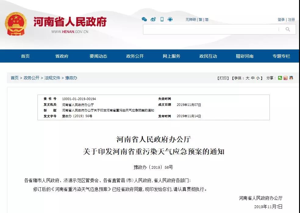 據了解,昨日(11月14日),河南省人民政府發布《關于印發河南省重污染天氣應急預案的通知》稱:當預測可能出現上述重污染天氣時,應當按空氣質量預報結果上限確定預警級別。當全省6個及以上相鄰的省轄市(濟源產城融合示范區)同時達到橙色或紅色預警條件時,啟動該級別的省級預警。當發布橙色預警時,啟動Ⅱ級應急響應。根據減排需要,在橙色及以上預警期間采取統一應急減排措施。對新興產業、戰略性產業和保障民生的企業,應當根據實際情況采取減排措施,盡量避免對正常生產生活的影響。對承擔協同處置城市生活垃圾或危險廢物、涉及居民供暖等民生保障類企業,在保障任務完成的同時,核定最大允許生產負荷,實施“以量定產”或“以熱定產”。