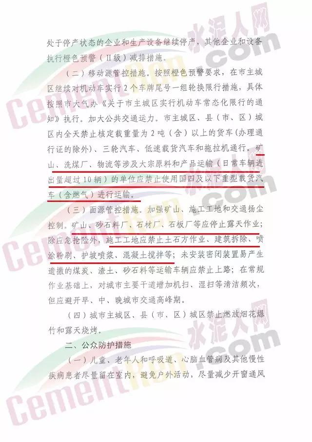 揚塵源減排措施。礦山、砂石料廠、石材廠、石板廠等停止露天作業;施工工地停止土石方作業(包括停止建筑拆除、土石方開挖、回填、場內倒運、摻拌石灰、混凝土剔鑿等作業,停止建筑工程配套道路和管溝開挖作業);建筑垃圾清運車輛和砂石運輸車輛禁止上路行駛,開挖土石方的挖掘機等非道路移動機械停止作業。