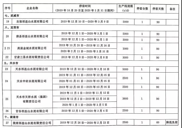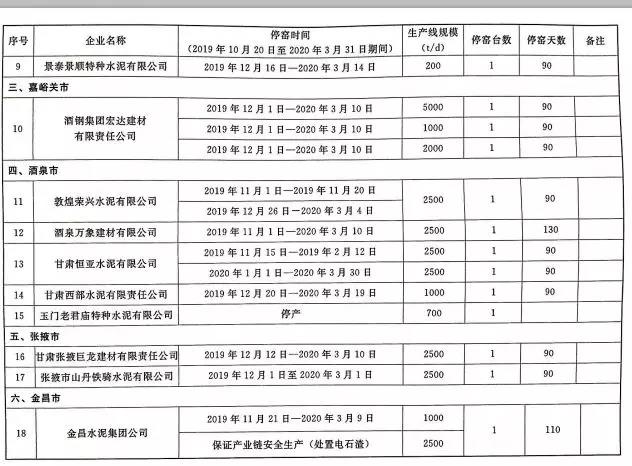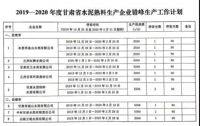 2019~2020年度甘肅省水泥熟料生產(chǎn)企業(yè)錯峰生產(chǎn)工作計(jì)劃,其中涉及34家水泥企業(yè),名單如下: