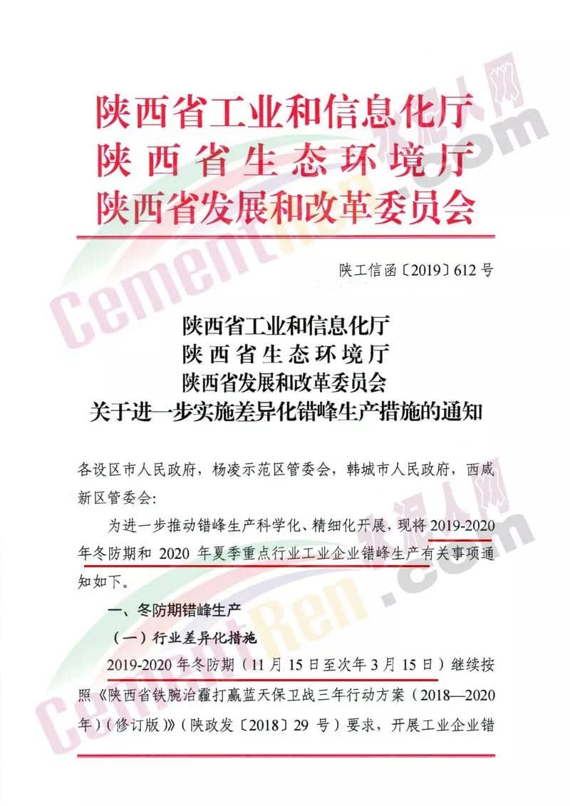 日前,陜西省工信廳生態(tài)環(huán)境廳發(fā)展委三個部門聯(lián)合發(fā)布《關(guān)于進(jìn)一步實(shí)施差異化錯峰生產(chǎn)措施的通知》。通知稱為進(jìn)一步推動錯峰生產(chǎn)科學(xué)化、精細(xì)化開展,2019年-2020年冬防期和2020年夏季重點(diǎn)行業(yè)工業(yè)企業(yè)將進(jìn)行錯峰生產(chǎn)。