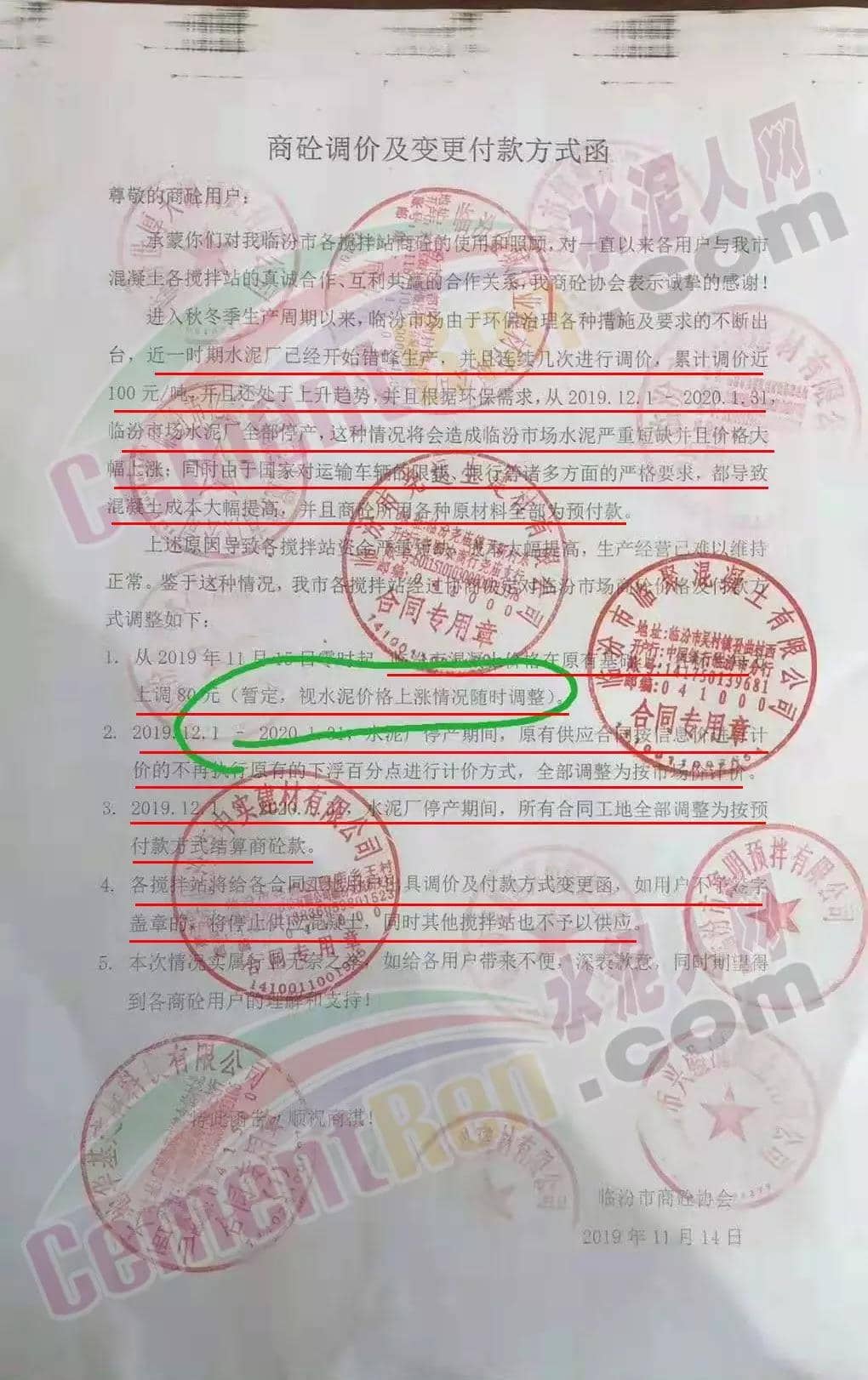 日前,山西臨汾市商砼協會發函稱,近一時期水泥廠已經開始錯峰生產,并且根據環保需求從12月1日至2020年1月有31日臨汾市水泥廠全部停產,這種情況將會造成臨汾市場水泥嚴重短缺并且價格大幅上漲,同時對運輸車輛超限加大力度治理再疊加銀行等諸多方面的嚴格要求,都導致混凝土成本大幅提高,并且商砼所用各種原材料全部為預付款。