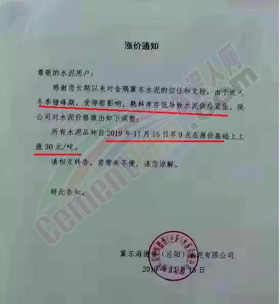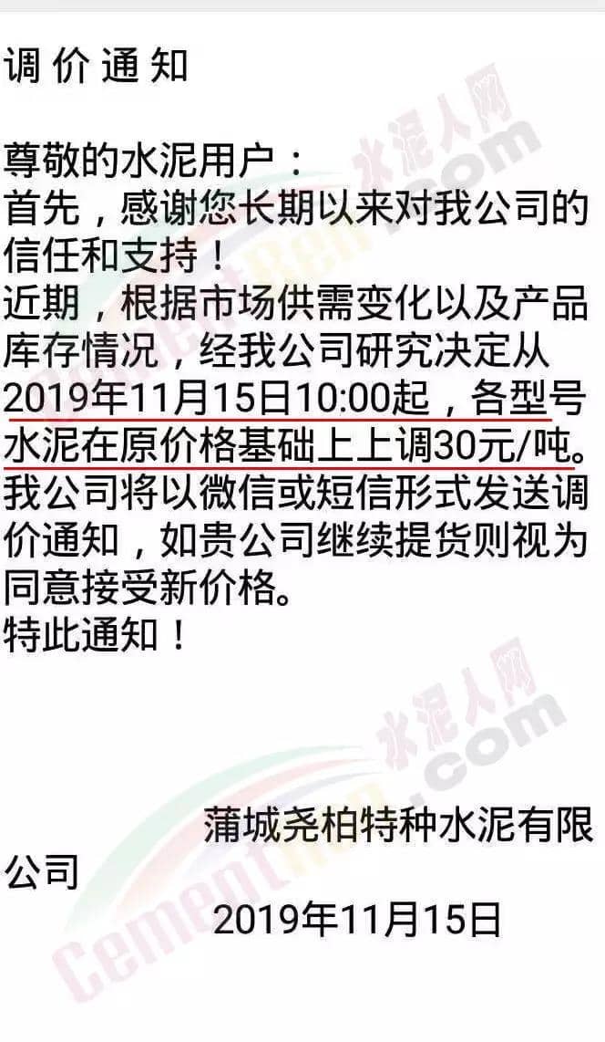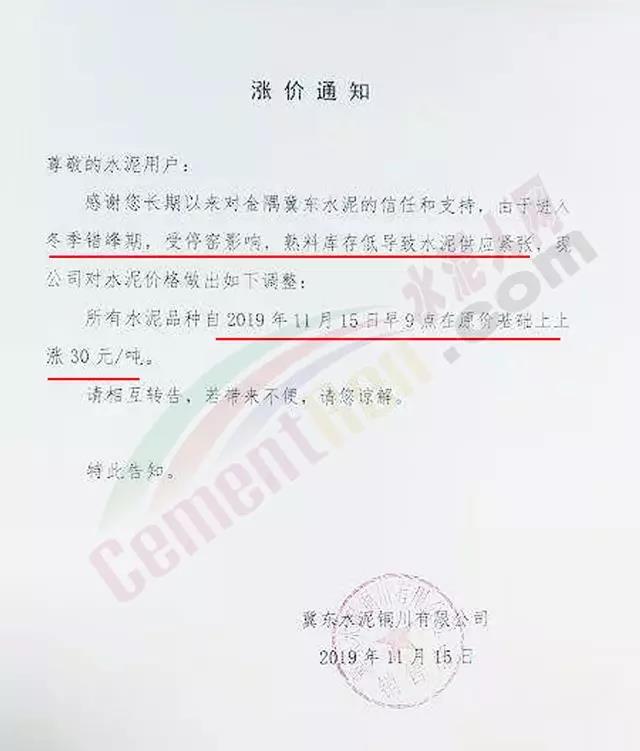 不僅砂石,昨日陜西關中地區冀東,聲威,堯柏等多家主導企業通知上調水泥價格。銅川冀東水泥漲價通知稱,由于進入冬季錯峰期,受停窯影響,熟料庫存低導致水泥供應緊張。所有水泥品種自11月15日早9點在原價基礎上上調30元/噸。