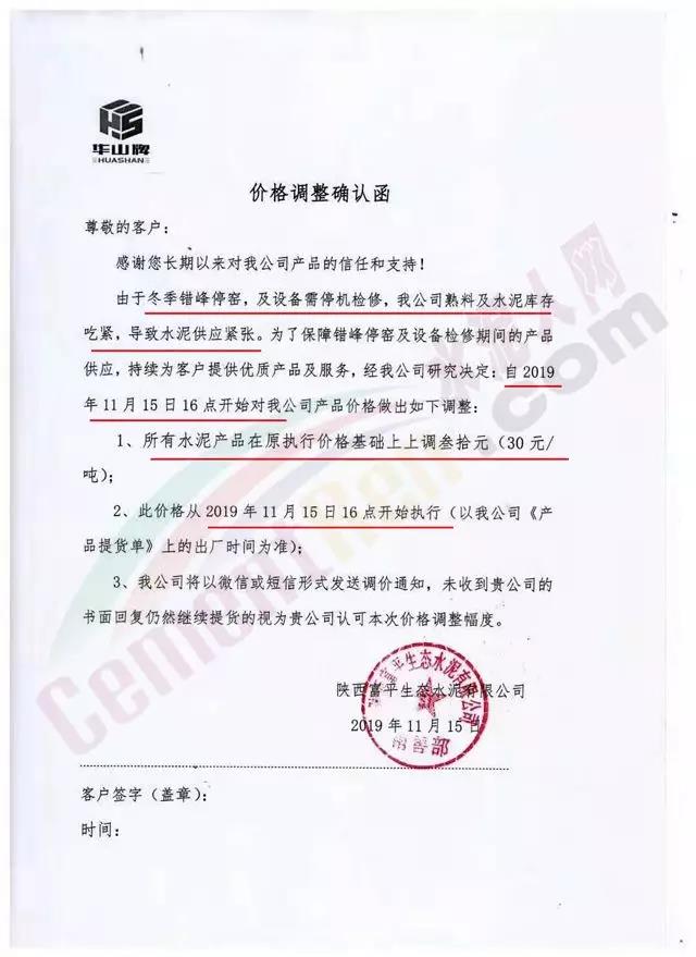 陜西富平生態水泥有限公司價格調整確認函稱,由于冬季錯峰停窯及設備需停機檢修,公司熟料及水泥庫存吃緊,導致水泥供應緊張。為保障錯峰停窯及設備檢修期間的產品供應,經公司研究決定自11月15日16時起對公司產品價格上調30元/噸。