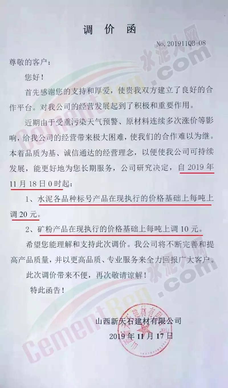 同一天,山西新天石建材有限公司發(fā)調(diào)價(jià)函稱,近期由于受重污染天氣預(yù)警、原材料連續(xù)多次漲價(jià)等影響,給公司的經(jīng)營帶來極大困難。經(jīng)公司研究決定自今日(11月18日)0時(shí)起:水泥各品種標(biāo)號(hào)產(chǎn)品在現(xiàn)執(zhí)行的價(jià)格基礎(chǔ)上每噸上調(diào)20元;礦粉產(chǎn)品在現(xiàn)執(zhí)行價(jià)格基礎(chǔ)上每噸上調(diào)10元。