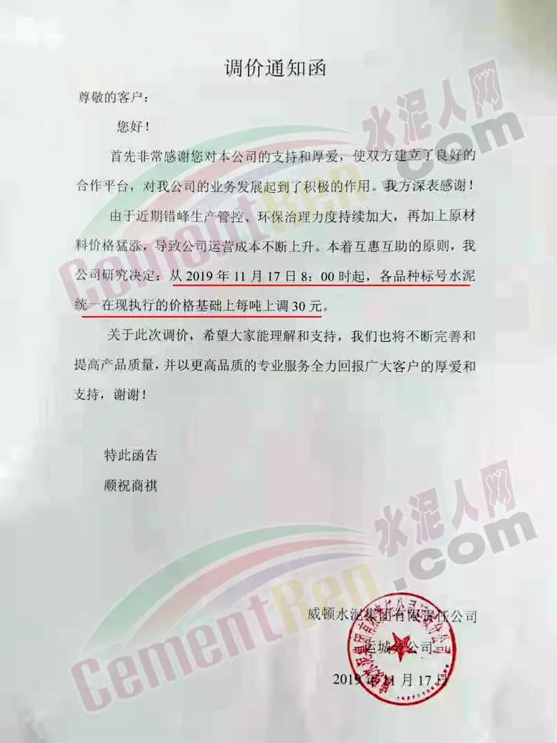 威頓水泥調(diào)價(jià)通知函稱,由于近期錯(cuò)峰生產(chǎn)管控、環(huán)保治理力度持續(xù)加大,再加上原材料價(jià)格猛漲,導(dǎo)致公司運(yùn)營成本不斷上升。經(jīng)公司研究決定 自11月17日早8時(shí)起,各品種標(biāo)號(hào)水泥統(tǒng)一在現(xiàn)執(zhí)行的價(jià)格基礎(chǔ)上每噸上調(diào)30元。