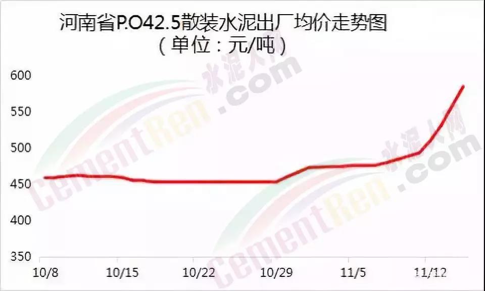 圖1:河南省P.O42.5散裝水泥出廠均價(jià)走勢圖從圖中可以看出,10月末至今河南省P.O42.5散裝水泥出廠均價(jià)漲幅超過100元/噸。近期,除少部分地區(qū)上調(diào)30-60元/噸外,多數(shù)區(qū)域水泥價(jià)格漲幅100元/噸以上。