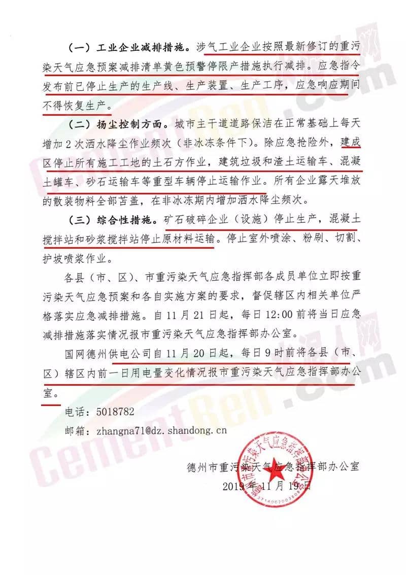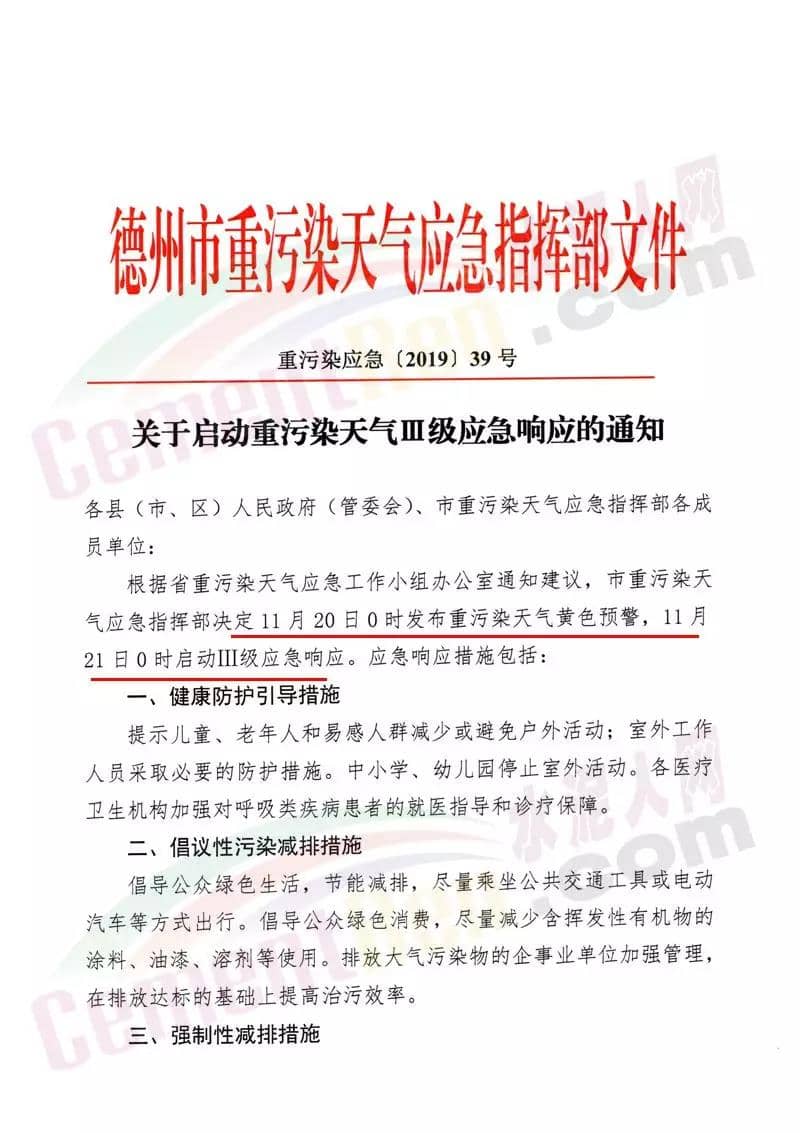 德州市重污染天氣應急指按部發布通知文件稱,根據省重污染天氣應急工作小組辦公室通知建議,德州市重污染天氣應急指揮部決定 11月20日0時發布重污染天氣黃色預警,11月21日0時啟動III級應急響應。應急呼應措施包括:工業企業減排措施,涉氣工業企業按照最新修訂的重污染天氣應急預案 減排清單黃色預警停限產措施執行減排 。應急指令發布前已停止生產的生產線、生產裝置、生產工序,應急響應期間不得恢復生產。揚塵控制方面,建成區停止所有施工工地的土石方作業,建筑垃圾和渣土運輸 車、混凝土罐車、砂石運輸車等重型車輛停止運輸作業。礦石破碎企業(設施)停止生產,混凝土攪拌站和砂漿攪拌站停止原材料運輸 。國網供電公司自11月20日起,每日9時前將各縣 (市、區)轄區內前一日用電量變化情況報重污染天氣應急指揮部辦公室。通知原文如下:
