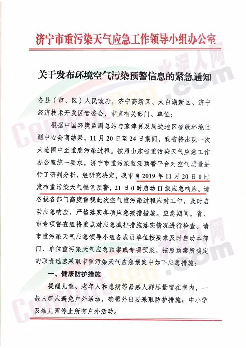 濟寧市重污染天氣應急工作領導小組通知文件稱濟寧市自11月20日0時發布重污染天氣橙色預警。21日0時啟動II級應急響應。