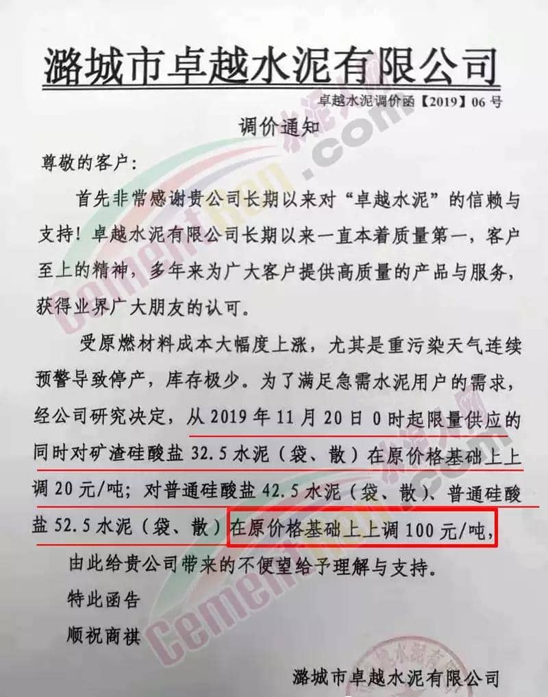 昨日(19日)山西潞城卓越水泥有限公司發布調價通知稱,受原燃材料成本大幅度上漲,尤其是重污染天氣連續預警導致停產,庫存極少。為了滿足急需水泥用戶的需求,經公司研究決定 ,從11月20日0時起限量供應的同時對礦渣硅酸鹽32.5水泥(袋、散)在原價格基礎上上調20元/噸;對普通硅酸鹽42.5水泥(袋、散)、普通硅酸鹽52.5水泥(袋、散)在原價格基礎上上調100元/噸。