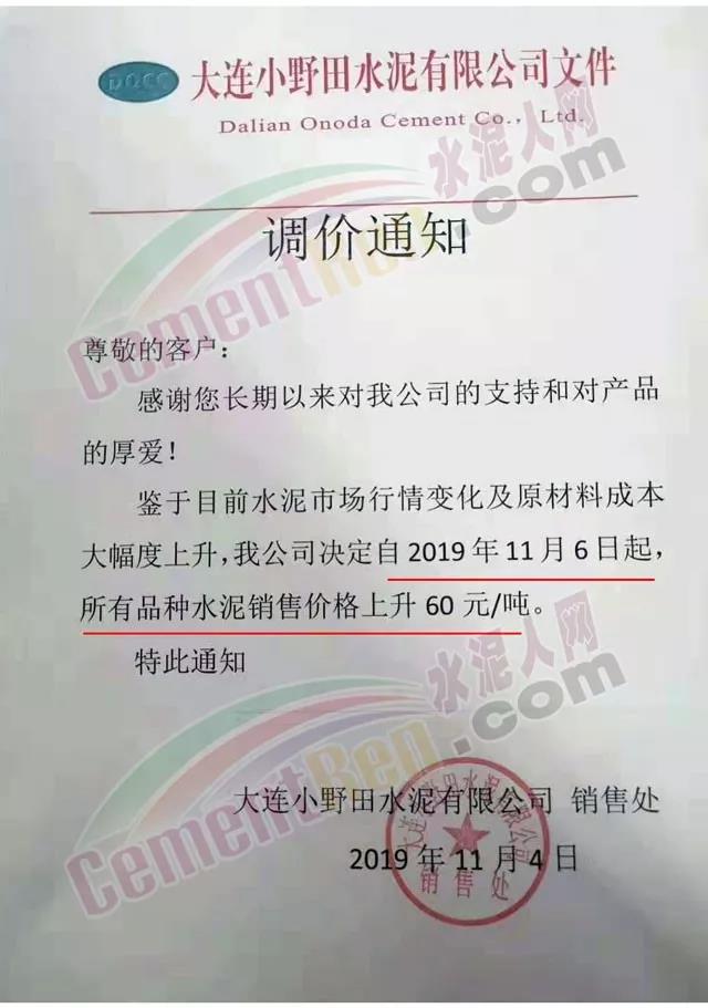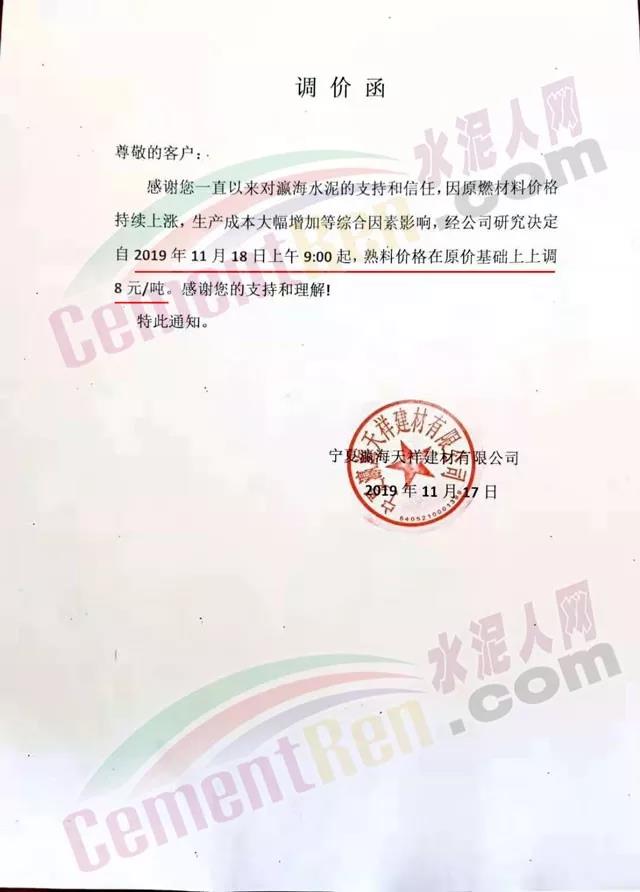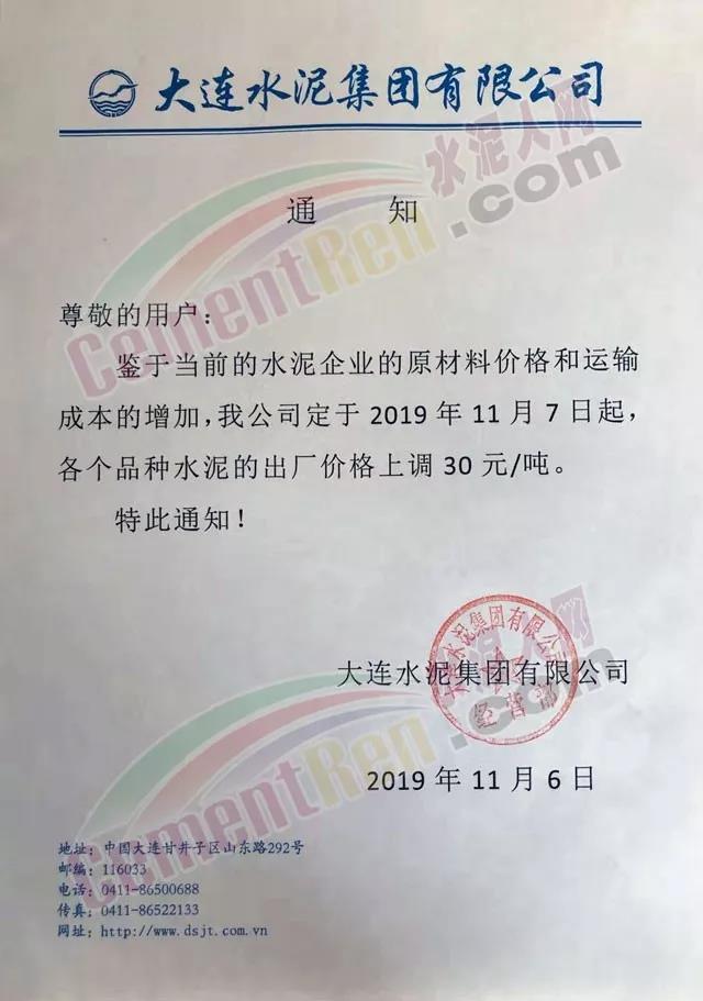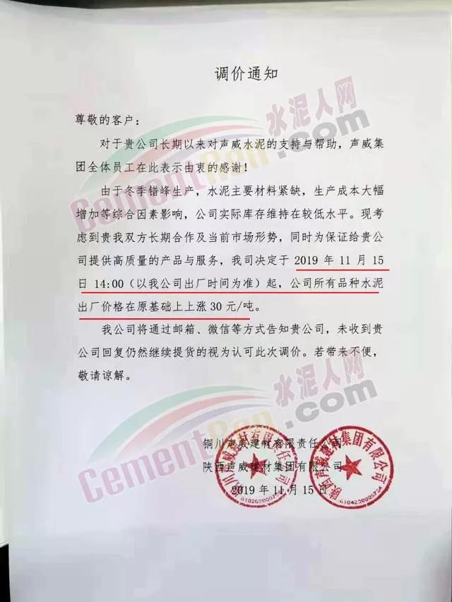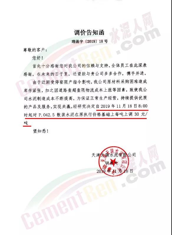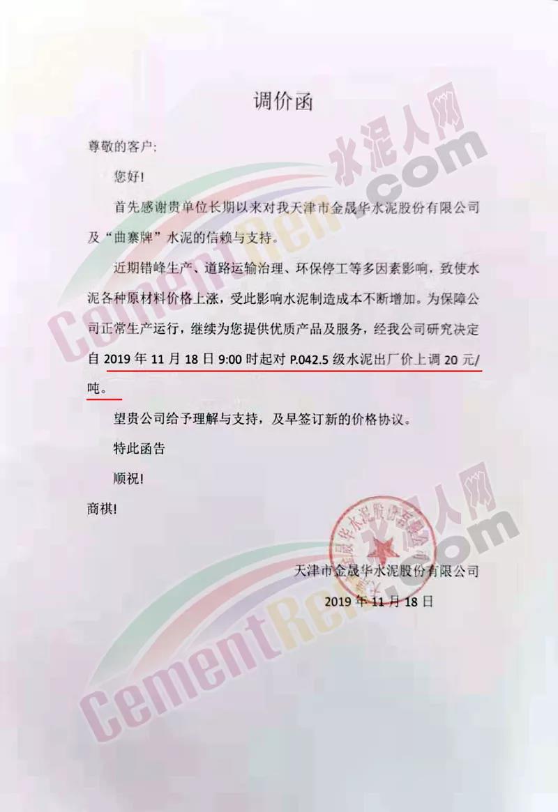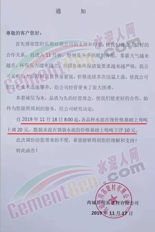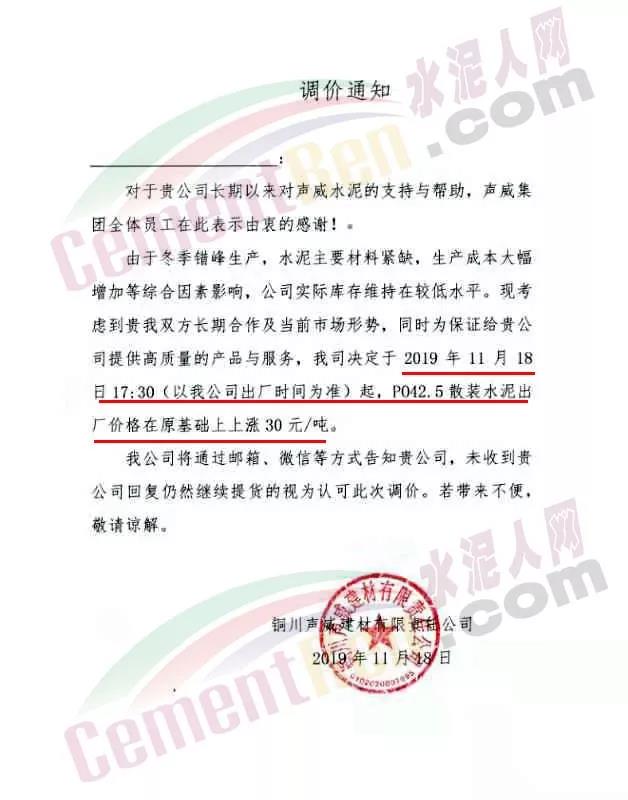 天津市金晟華水泥股份有限公司調價通知稱,近期錯峰生產,道路運輸治理、環保停工等多因素影響,致使水泥各種原材料價格上漲,受此影響水泥制造成本不斷增加,為保障公司正常生產運行,經公司研究決定自11月18日9時起對PO42.5級水泥出廠價上調20元/噸。
