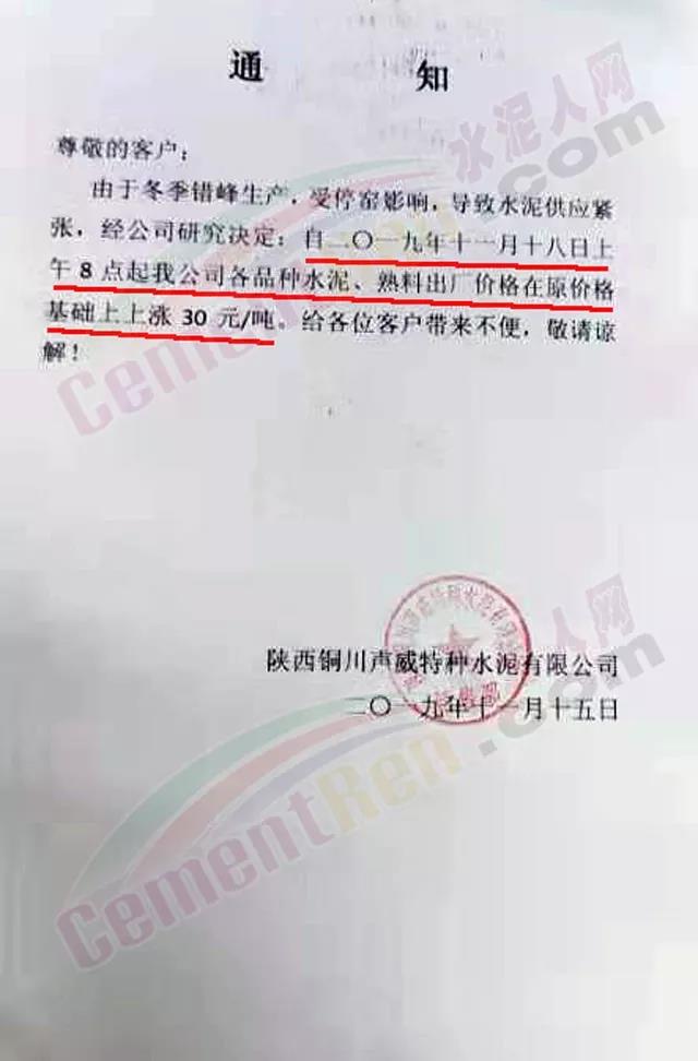 據水泥人網了解,18日上午山西多家工廠都通知沒貨了。經銷商當日下午又跨境到陜西銅川區域,車剛到企業就通知上調熟料和水泥價格了。據水泥人網了解,經銷商提到的銅川聲威建材有限公司近期已經發過兩次提價通知了。15日上調30元/噸,18日又上調30元/噸,合計上調60元/噸。