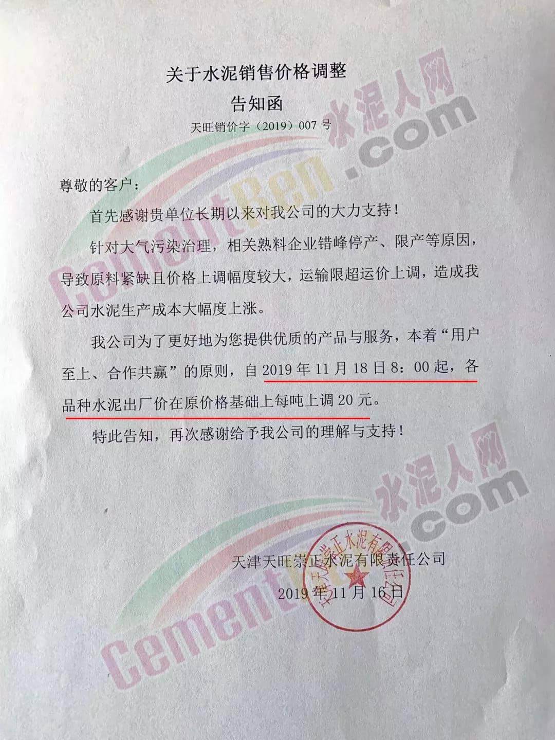 天津天旺崇正水泥有限責任公司關于水泥銷售主價格調整的告知函稱,針對大氣污染治理,相關熟料企業錯峰停產、限產等原因導致原料緊缺且價格上調幅度較大,運輸限超運價上調,造成我公司水泥生產成本大幅度上漲。公司決定自11月18日8時起各品種水泥出廠價在原價格基礎上每噸上調20元。