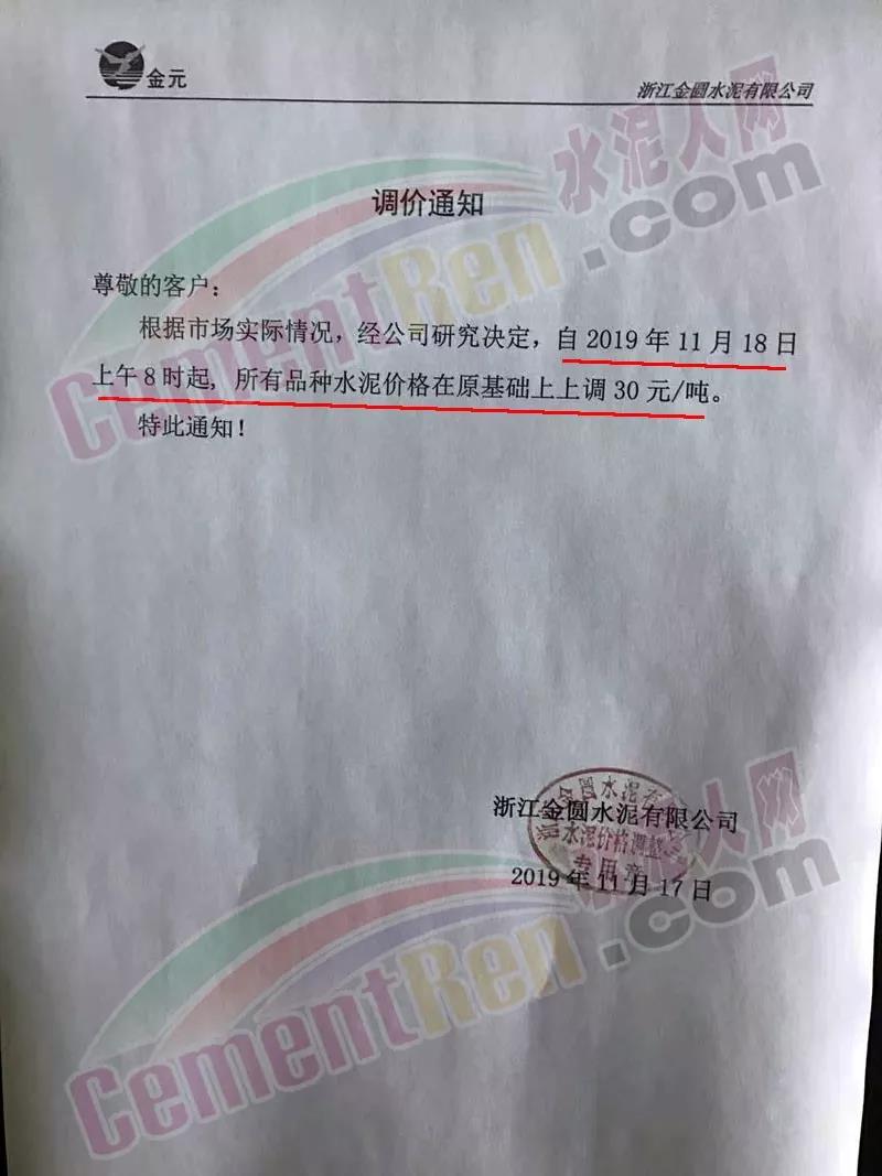 18日浙江省區域主導企業紅獅水泥、金圓水泥也發布了調價通知,自11月18日上午7時起,水泥在原價基礎上上調30元/噸。