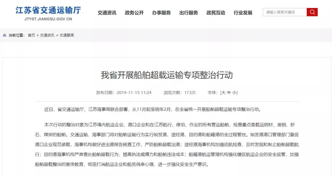 日前江蘇省交通運輸廳、海事局聯合部署,從2019年11月起至2020年2月,在全省統一開展船舶超載運輸專項整治行動!