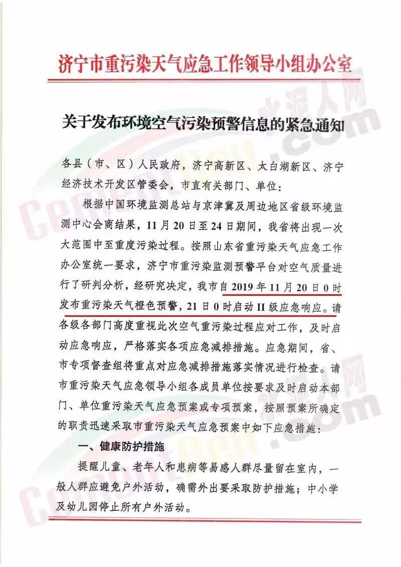11月19日山東省重污染天氣應急工作小組辦公室發布通知,建議濟南、淄博 、棗莊、東營、維坊、濟寧、泰安、日照、臨沂、德州、聊城、濱州、菏澤13市根據空氣質量預測會商結果,于11月20日零時前發布預警,11月21日零時前應動應急響應。預警期間對工業企業要按照最新修訂的應急減排清單采取限產停產等減排措施;對建筑 工地等揚塵源停止產能揚塵環節的建筑施工作業及渣土運輸;加強重型柴油貨車管控措施,最大限度減少上路運輸行駛等。
