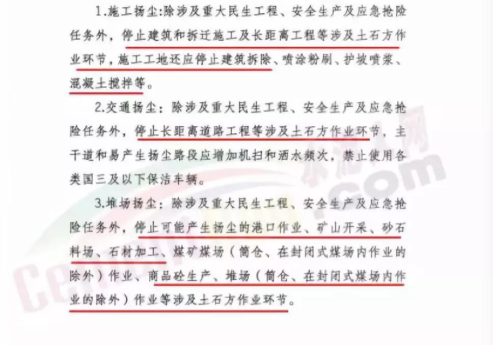 3.除涉及重大民生工程、安全生產及應急搶險任務外,停止所有施工工地的土石方作業(包括停止土石方開挖、回填、場內倒運、摻拌石灰、混凝土剔鑿等作業,停止建筑工程配套道路和管溝開挖作業)。