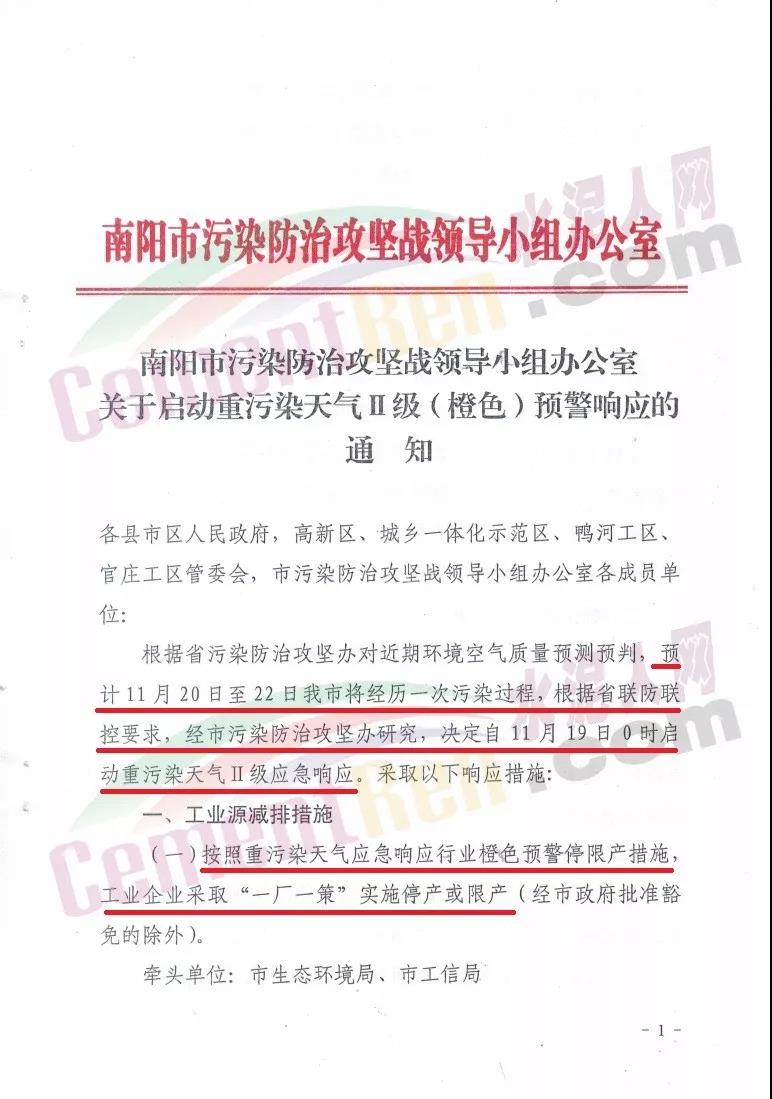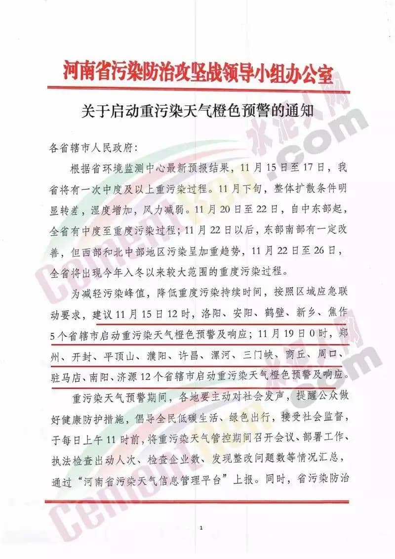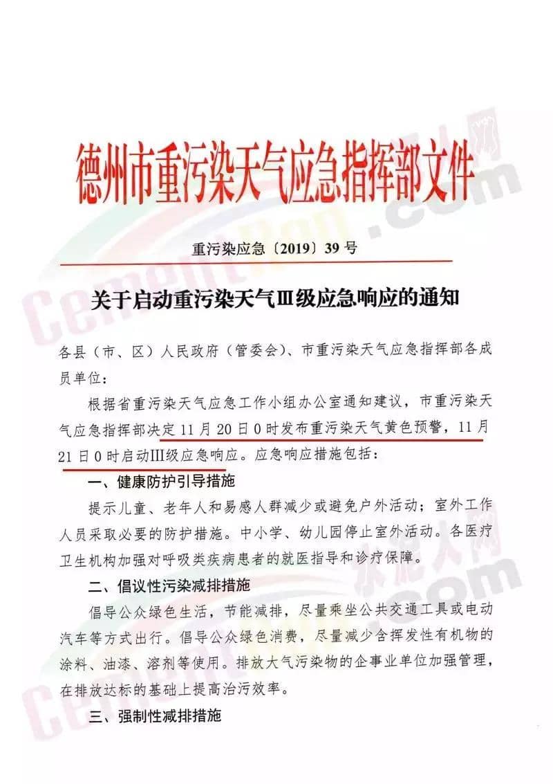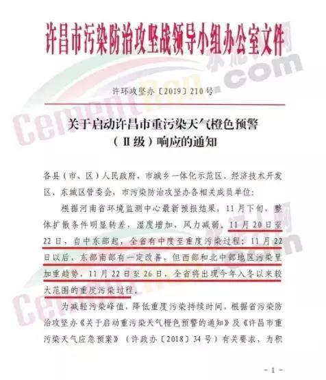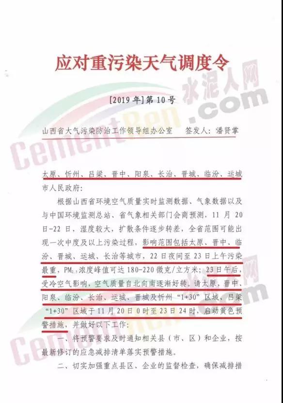 長治市重污染天氣應急指按部辦公室通知文件要求自11月20日0時開始全市啟動重污染天氣黃色(III級)預警,要求水泥、建材行業停產。