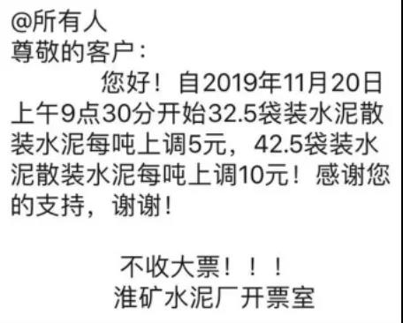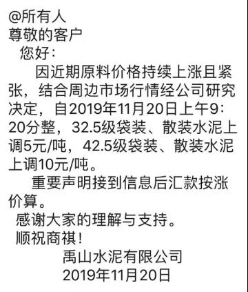 淮北市天助水泥公司通知稱:由于原材料價格上漲且供應緊張,經公司研究決定自2019年11月20日早上八點起,所以品種袋散價格上調10元每噸。