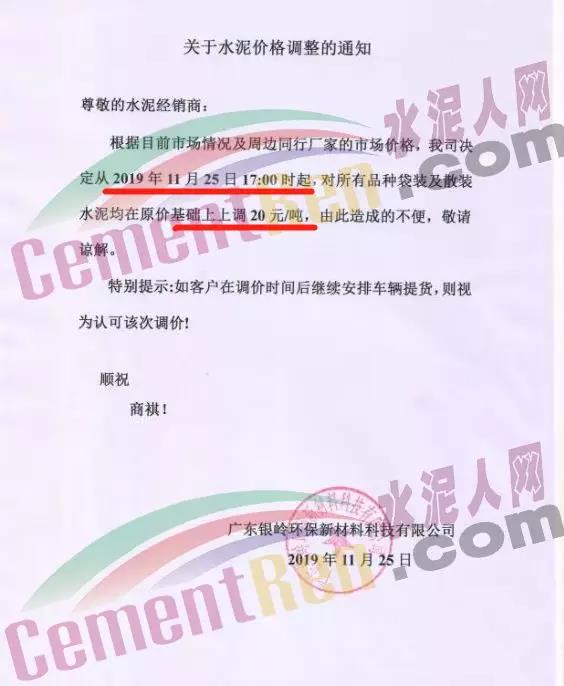 廣東銀鈴環保新材料科技有限公司發布了關于水泥價格調整的通知稱,根據市場情況及周邊同行廠家的市場價格,決定從2019年11月25日17:00時起,對所有品種袋裝及散裝水泥均在原價基礎上上調20元/噸。