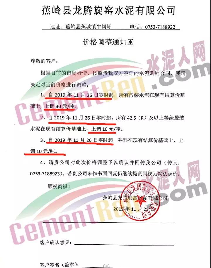 蕉嶺縣龍騰旋窯水泥有限公司發布了調價函稱,根據目前的市場行情,按照貴我雙方簽訂的水泥購銷合同,對水泥價格進行了調整:自2019年11月26日零時起,所有散裝水泥在現有結算價基礎上,上調30元/噸。42.5(R)及以上等級袋裝水泥在現有結算價基礎上,上調10元/噸,熟料在現有結算價基礎上,上調10元/噸。