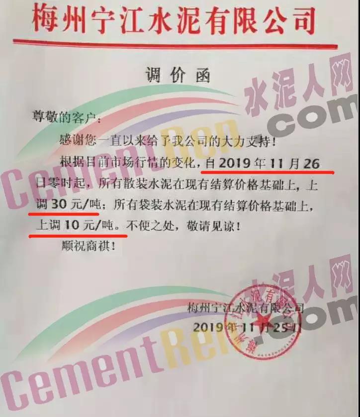 梅州市寧江水泥有限公司發布了調價函稱,根據目前市場行情變化,自2019年11月26日零時起,所有散裝水泥在現有結算的價格基礎上,上調30元/噸,所有袋裝水泥在現有結算價格基礎上,上調10元/噸。