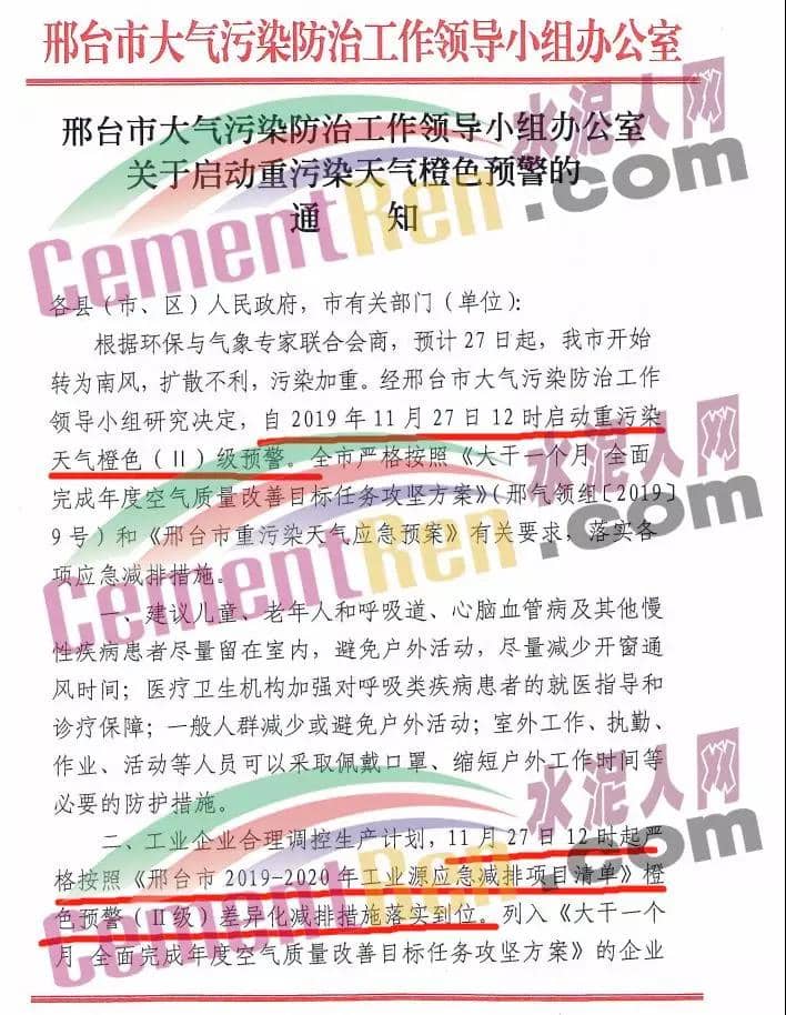 據(jù)水泥人網(wǎng)消息,昨日(11月26日)水泥大省河北省邢臺市大氣污染防治工作領(lǐng)導(dǎo)小組辦公室發(fā)布《關(guān)于啟動重污染天氣橙色預(yù)警的通知》稱,自2019年11月27日12時啟動重污染天氣橙色(II)級預(yù)警。本次啟動重污染天氣距離上次解除重污染天氣僅僅只有3天時間。