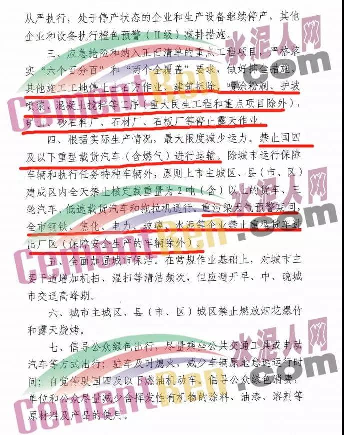 應(yīng)急搶險和納入正面清單的重點工程項目,嚴(yán)格落實“六個百分百”和“兩個全覆蓋”要求,做好抑塵措施。其他施工工地停止土石方作業(yè)、建筑拆除、噴涂粉刷、護坡噴漿、混凝土攪拌等工序(重大民生工程和重點項目除外),礦山、砂石料廠、石材廠、石板廠等停止露天作業(yè)。 根據(jù)實際生產(chǎn)情況,最大限度減少動力。禁止國四及以下重型載貨汽車(含燃氣)進行運輸。除城市運行保障車輛和執(zhí)行任務(wù)特種車輛外,原則上市主城區(qū)、縣(市、區(qū))建成區(qū)內(nèi)全天禁核定載重量為2噸(含)以上貨車、三輪汽車、低速載貨汽車和拖拉機通行。重污染天氣預(yù)警期間,全市鋼鐵、焦化、電力、玻璃、水泥等企業(yè)禁止重型貨車進出廠區(qū)(保障安全生產(chǎn)的車輛除外)。全文如下: