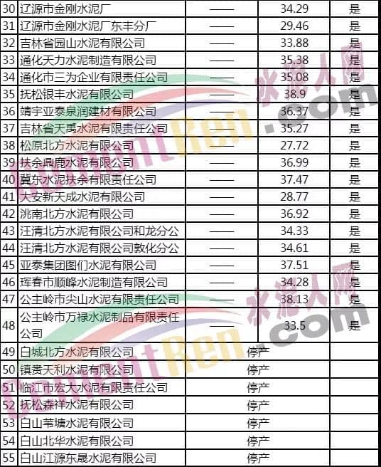 其中得知,55家水泥企業中,白城北方水泥有限公司、鎮賚天利水泥有限公司、臨江市宏大水泥有限責任公司、撫松森祥水泥有限公司、白山葦塘水泥有限公司、白山北華水泥有限公司、白山江源東晟水泥有限公司7家水泥企業處于停產狀態。