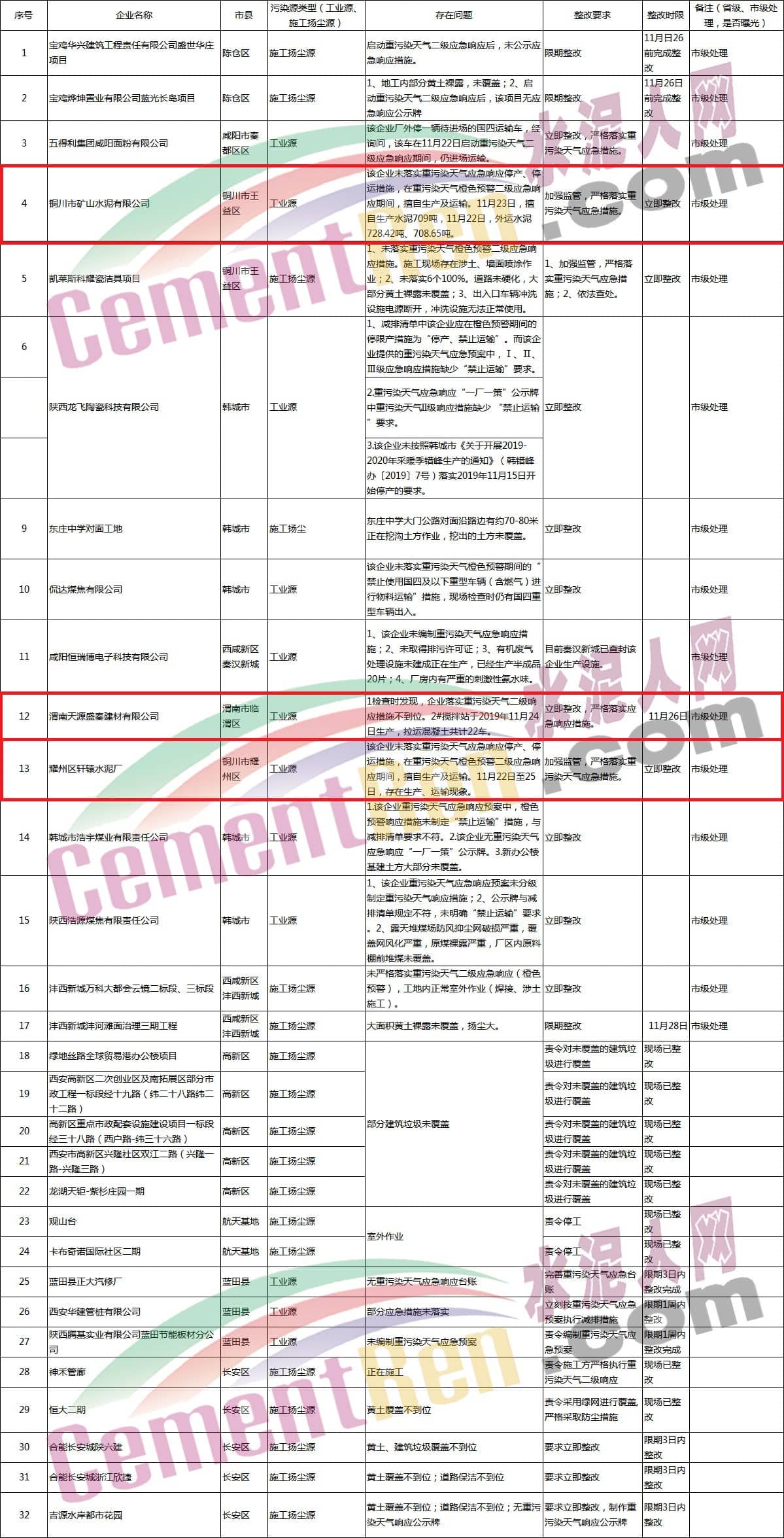 日前,水泥人網自陜西省生態環境廳獲悉,按照陜西省重污染天氣應急指揮部辦公室《關于提示應對重污染天氣的函》要求,陜西省生態環境執法總隊及各市區執法部門對重污染天氣應急響應措施執行情況進行了專項執法檢查,相關檢查問題匯總如下: