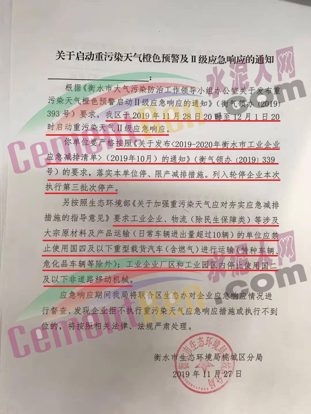 強制性污染減排措施要求工業企業嚴格執行《關于發布〈2019-2020年衡水市工業企業應急減排清單〉(2019年10月)的通知》(衡氣領辦〔2019〕339號)的清單中橙色預警減排措施。施工工地、工業企業廠區和工業園區內禁止使用國二及以下的非道路移動機械(除清潔能源和緊急檢修作業)、不達標的非道路移動機械,建筑垃圾和渣土運輸車、砂石運輸車輛禁止上路行駛。按照生態環境部《關于加強重污染天氣應對夯實應急減排措施的指導意見》要求工業企業、物流(除民生保障類)等涉及大宗原材料及產品運輸(日常車輛進出量超過10輛)的單位應禁止使用國四及以下重型載貨汽車(含燃氣)進行運輸(特種車輛、危化品車輛等除外)。
