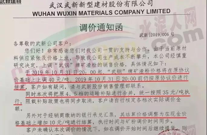 同期,武漢武新新型建材股份有限公司發(fā)調(diào)價(jià)通知上調(diào)“武鋼”礦渣粉價(jià)格40元/噸。