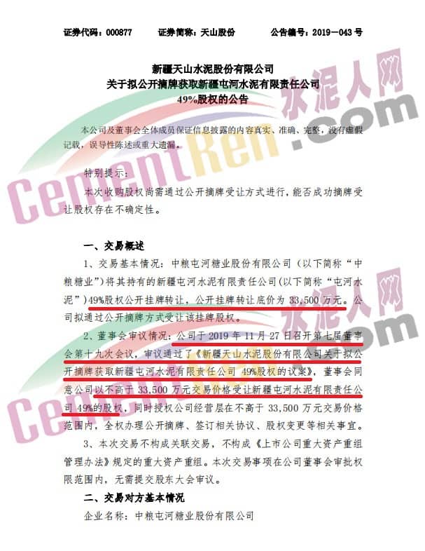 據(jù)了解,天山股份于2019年11月27日召開第七屆董事會(huì)第十九次會(huì)議,審議通過了《新疆天山水泥股份有限公司關(guān)于擬公開摘牌獲取新疆屯河水泥有限責(zé)任公司49%股權(quán)的議案》,董事會(huì)同意公司以不高于33500萬元交易價(jià)格受讓新疆屯河水泥有限責(zé)任公司49%的股權(quán),同時(shí)授權(quán)公司經(jīng)營層在不高于33500萬元交易價(jià)格范圍內(nèi),全權(quán)辦理公開摘牌、簽訂相關(guān)協(xié)議、股權(quán)變更等相關(guān)事宜。