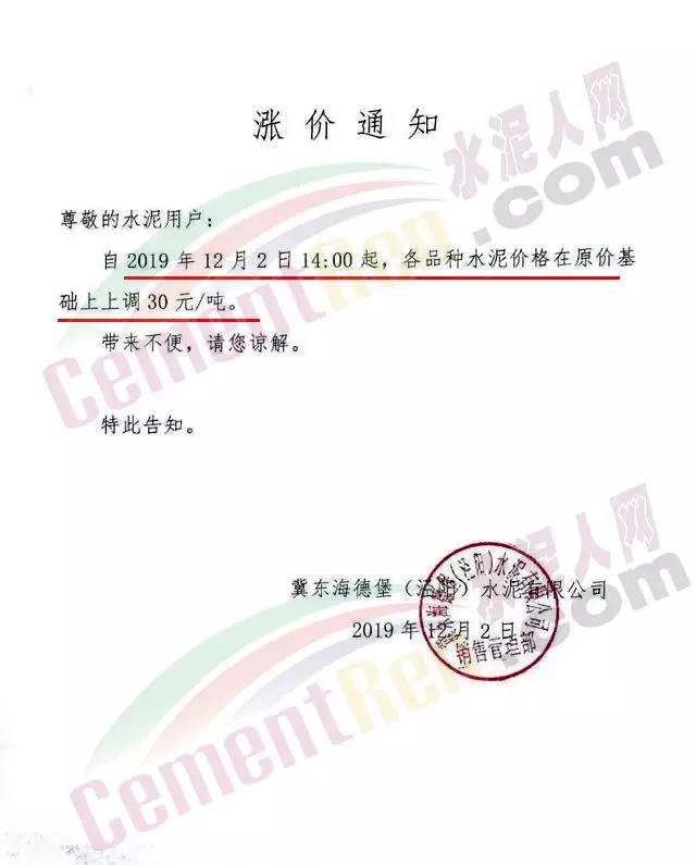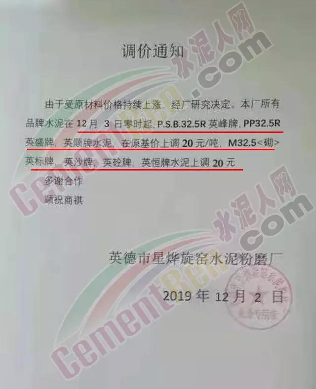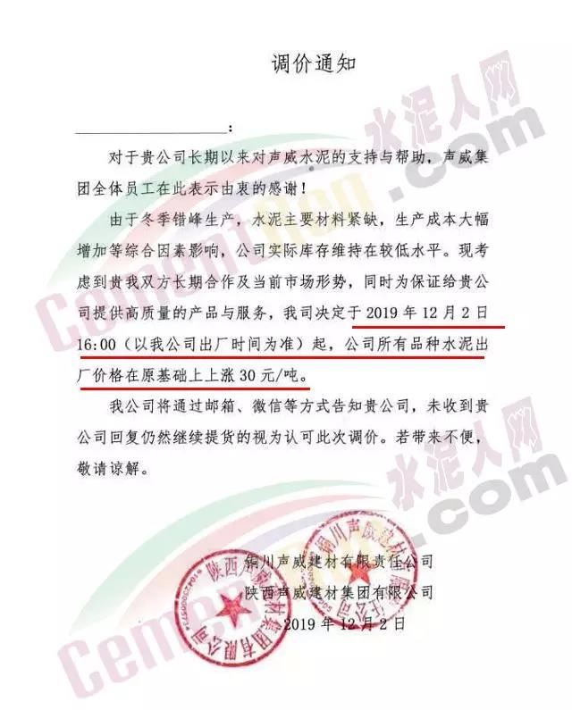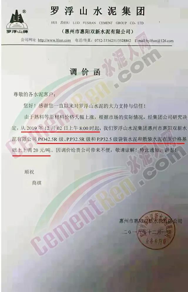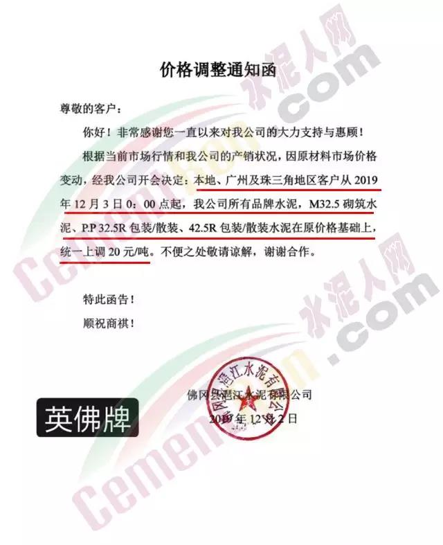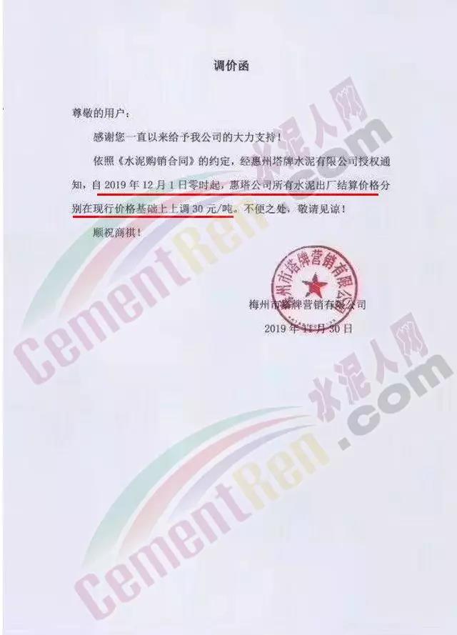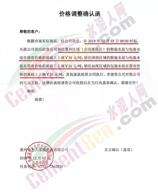 惠州光大水泥價(jià)格調(diào)整確認(rèn)函稱,自12月3日起銷往惠州區(qū)域(含河源地區(qū))的散裝水泥與包裝水泥在原價(jià)基礎(chǔ)上上調(diào)30元/噸;銷往深圳區(qū)域的上調(diào)20元/噸,銷往汕尾區(qū)域的包裝水泥在原價(jià)格基礎(chǔ)上上調(diào)20元/噸。