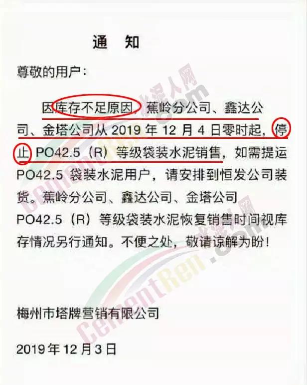 昨日(12月3日),梅州市塔牌營銷有限公司發布通知稱,因庫存不足原因,焦嶺分公司、鑫達公司、金塔公司從今日(12月4日)零時起停止PO42.5(R)等級袋裝水泥銷售,如需提運PO42.5(R)袋裝水泥用戶,請安排到恒發公司裝貨。焦嶺分公司、鑫達公司、金塔公司PO42.5(R)袋裝水泥恢復銷售時間視庫存情況另行通知。
