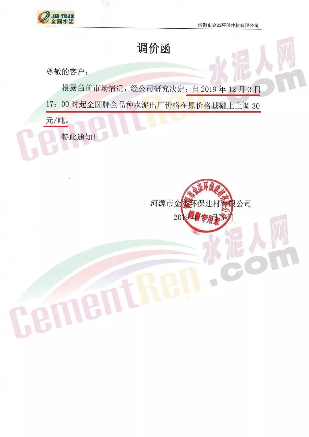河源市金杰環保建材有限公司12月3日發布了調價函稱,根據當前市場情況,經公司研究決定,自2019年12月3日17:00時起金圓牌全品種水泥出廠價格在原基礎上上調30元/噸。