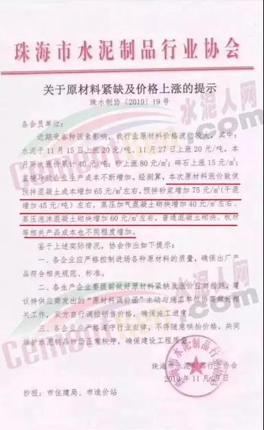 據了解,11月29日珠海市水泥制品行業協會曾發布調價通知稱,近期受各種因素影響,行業內原材料波動較大。其中,水泥與11月15日上漲20元/噸、11月27日上漲20元/噸,本月兩次漲價累計40元/噸;砂上漲80元/m³;碎石上漲15元/m³。