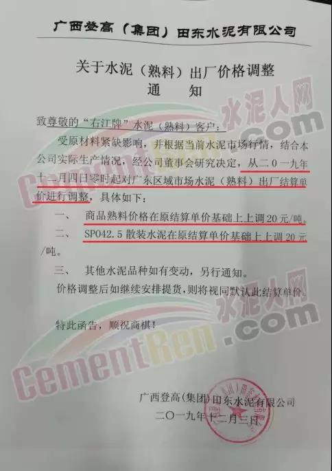廣西登高(集團)田東水泥有限公司也發布調價通知稱,收原材料緊缺影響,并根據當前水泥市場行情,結合實際生產情況,經董事會研究決定,從2019年12月4日0時起對廣東區域市場(熟料)進行調整,商品熟料價格在原結算單價基礎上上調20元/噸,SP042.5散裝水泥在原結算單價基礎上上調20元/噸,其他水泥品種如有變動,另行通知。