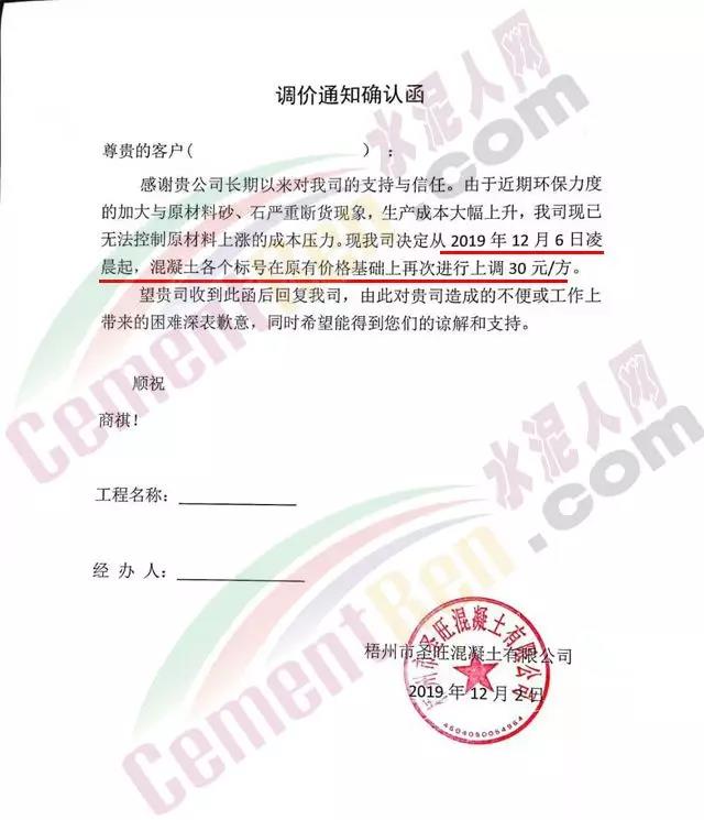 12月2日梧州市圣旺混凝土有限公司調價通知稱由于近期環保力度的加大與原材料砂、石嚴重斷貨,生產成本大幅上升,公司已無法控制原材料上漲的成本壓力。經公司研究決定 自12月6日凌晨起,混凝土各標號在原有價格上再次進行上調30元/方。