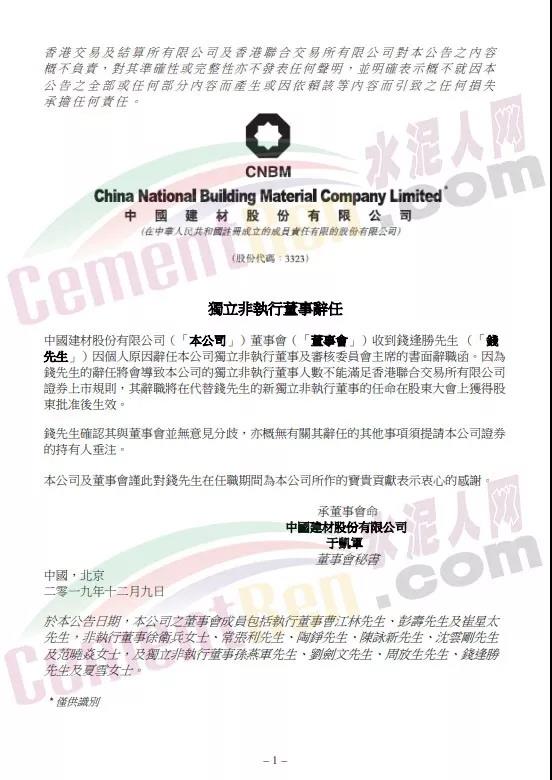 中國建材則公告表示,錢逢勝因個人原因辭任公司獨立非執行董事及審核委員會主席的書面辭職函。