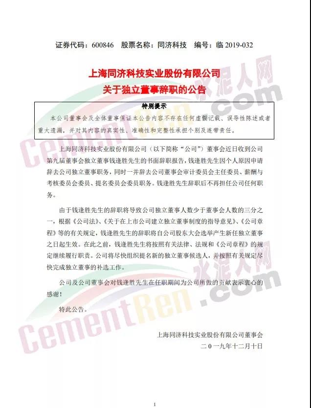 同濟科技公告稱,錢逢勝因個人原因申請辭去公司獨立董事職務,同時一并辭去公司董事會審計委員會主任委員、薪酬與考核委員會委員、提名委員會委員職務。錢逢勝先生辭職后不再擔任公司任何職務。