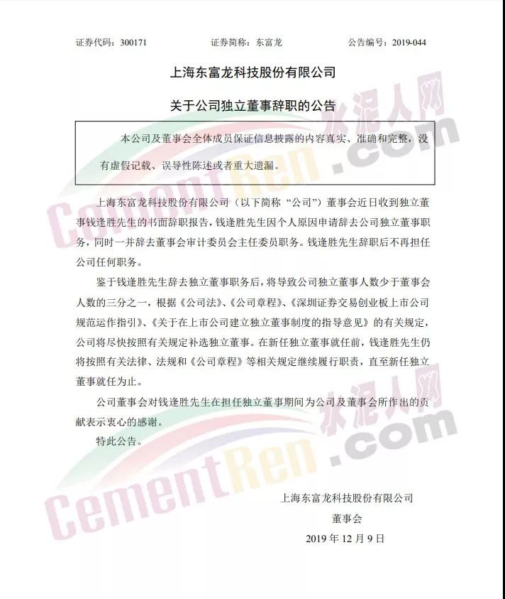 東富龍董事會則稱,錢逢勝因個人原因申請辭去公司獨立董事職務,同時一并辭去董事會審計委員會主任委員職務。