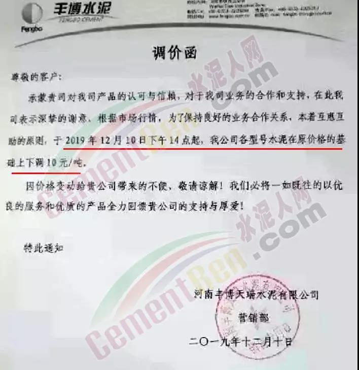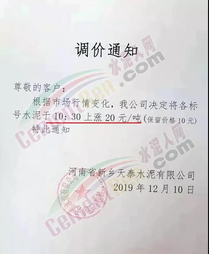 根據目前市場行情,經公司研究決定,自2019年12月12日零時起我司發往各區域水泥,熟料,出廠單價在原有基礎上上調30元/噸。