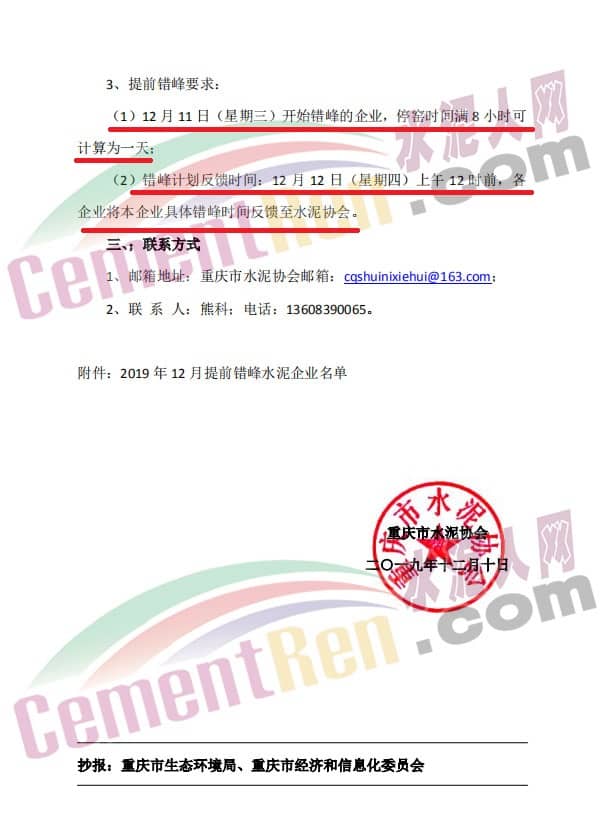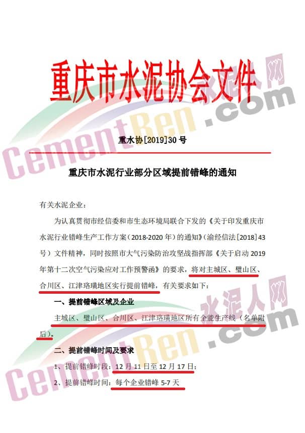 11月10日,重慶市水泥協(xié)會(huì)發(fā)布了《重慶水泥行業(yè)部分區(qū)域提前錯(cuò)峰的通知》稱(chēng),為認(rèn)真貫徹經(jīng)信委和市生態(tài)環(huán)境局聯(lián)合下發(fā)的《關(guān)于印發(fā)重慶市水泥行業(yè)錯(cuò)峰生產(chǎn)工作方案(2018-2020年)的通知》(渝經(jīng)信法[2018]43號(hào))文件精神,同時(shí)按照市大氣污染防治攻堅(jiān)戰(zhàn)指揮部《關(guān)于啟動(dòng)2019年第十二次空氣污染應(yīng)對(duì)工作預(yù)警函》的要求,對(duì)主城區(qū)、璧山區(qū)、合川區(qū)、江津珞璜地區(qū)實(shí)行提前錯(cuò)峰,提前錯(cuò)峰時(shí)段為12月11日至12月17日,每個(gè)企業(yè)錯(cuò)峰5至7天。具體如下: