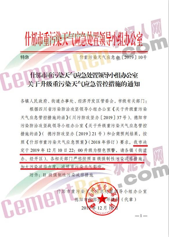 12月10日,四川省什邡市重污染天氣應(yīng)急處置領(lǐng)導(dǎo)小組辦公室和德陽(yáng)市生態(tài)環(huán)境局聯(lián)合發(fā)布了《關(guān)于升級(jí)重污染天氣應(yīng)急管控措施的通知》稱(chēng),根據(jù)四川省污染防治攻堅(jiān)領(lǐng)導(dǎo)小組辦公室《關(guān)于升級(jí)重污染天氣管控應(yīng)急措施的函》(川污防攻堅(jiān)辦[2019]37號(hào))、德陽(yáng)市污染防治攻堅(jiān)戰(zhàn)領(lǐng)導(dǎo)小組辦公室《關(guān)于升級(jí)重污染天氣應(yīng)急管控措施的函》(德污防攻堅(jiān)辦[2019]21號(hào))和會(huì)商預(yù)判結(jié)果,按照《什邡市重污染天氣應(yīng)急預(yù)案》(2018年修訂)要求,決定于2019年12月10日22:00升級(jí)橙色預(yù)警。具體減排措施如下: