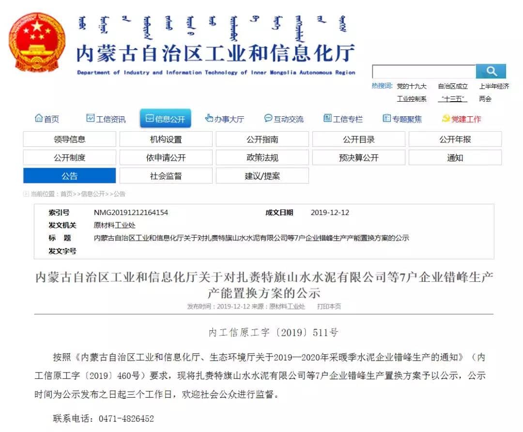 12月12日,內蒙古自治區工業和信息化廳《內蒙古自治區工業和信息化廳關于對扎賚特旗山水水泥有限公司等7戶企業錯峰生產產能置換方案的公示》。