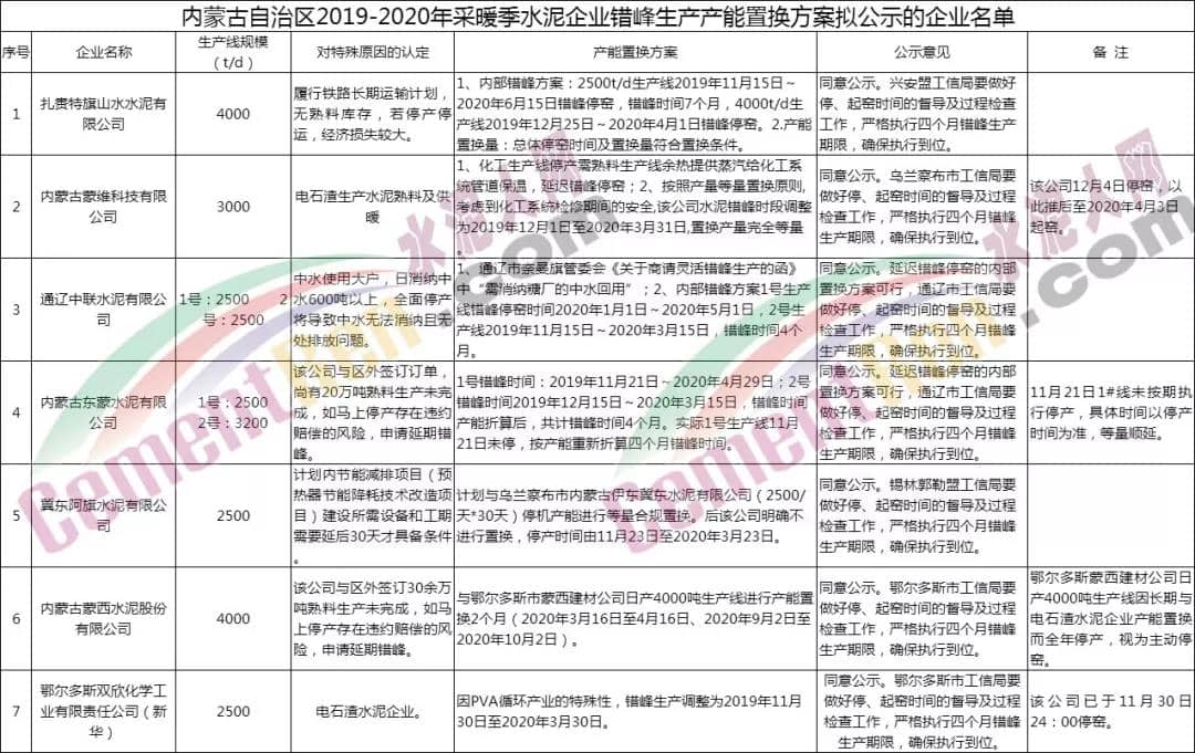 按照《內蒙古自治區工業和信息化廳、生態環境廳關于2019—2020年采暖季水泥企業錯峰生產的通知》(內工信原工字〔2019〕460號)有關規定,將扎賚特旗山水水泥有限公司、內蒙古蒙維科技有限公司、通遼中聯水泥有限公司、內蒙古東蒙水泥有限公司、冀東阿旗水泥有限公司、內蒙古蒙西水泥股份有限公司、鄂爾多斯雙欣化學工業有限責任公司(新華)7戶企業錯峰生產置換方案予以公示。