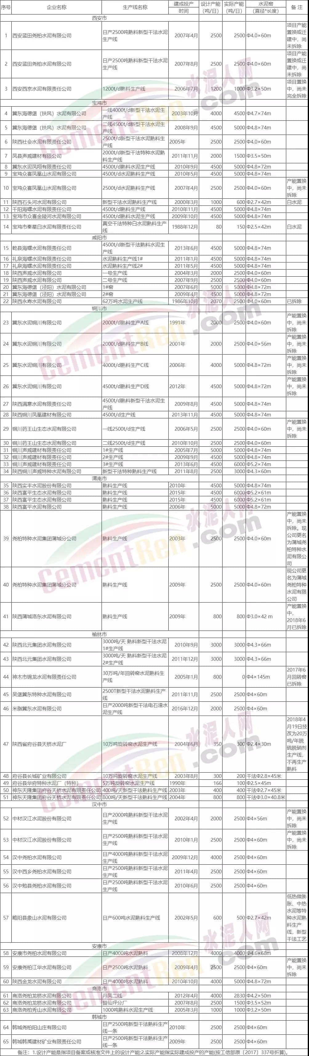 陜西省水泥熟料生產線清單