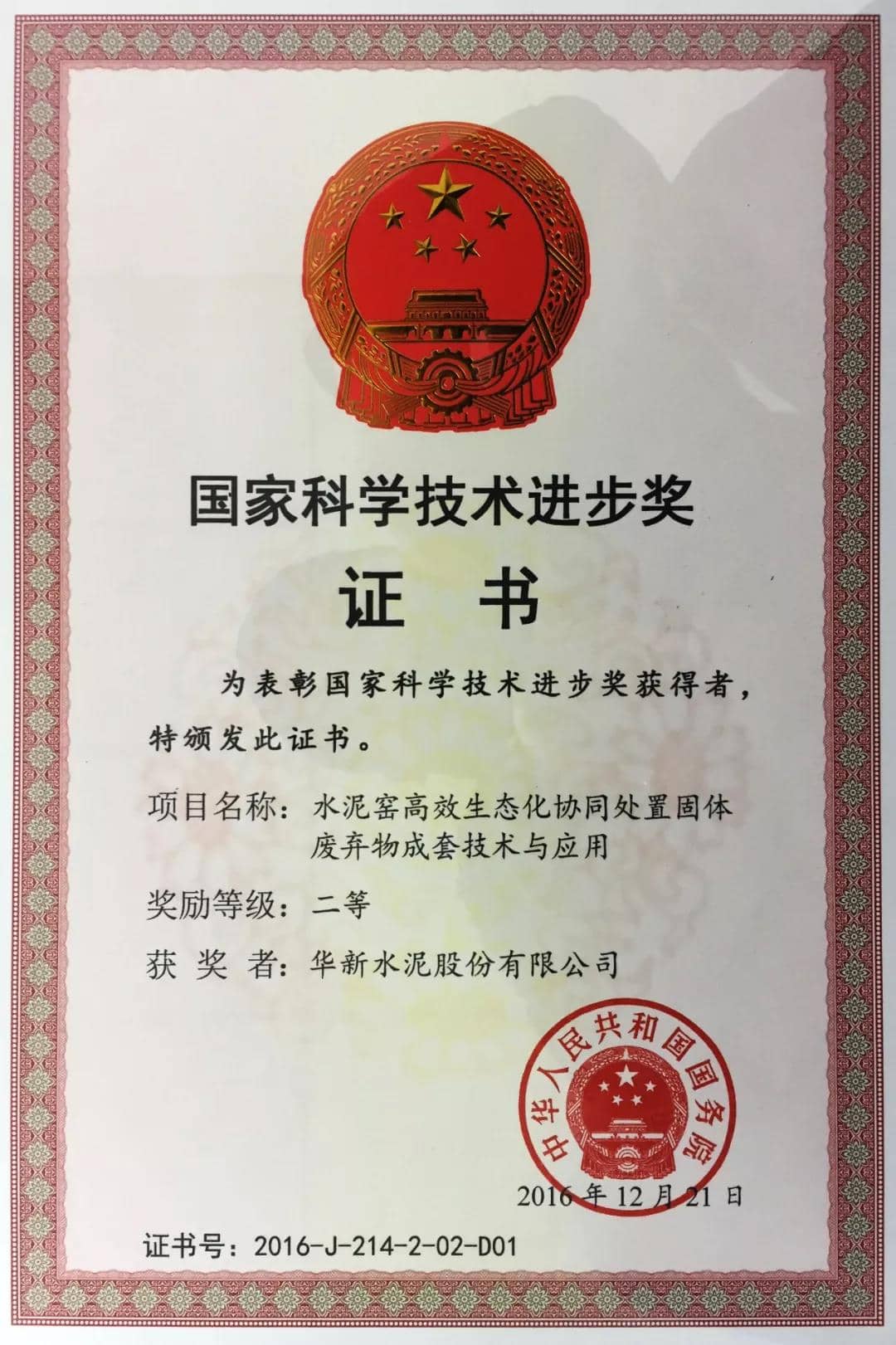 國家科學技術進步獎二等獎證書