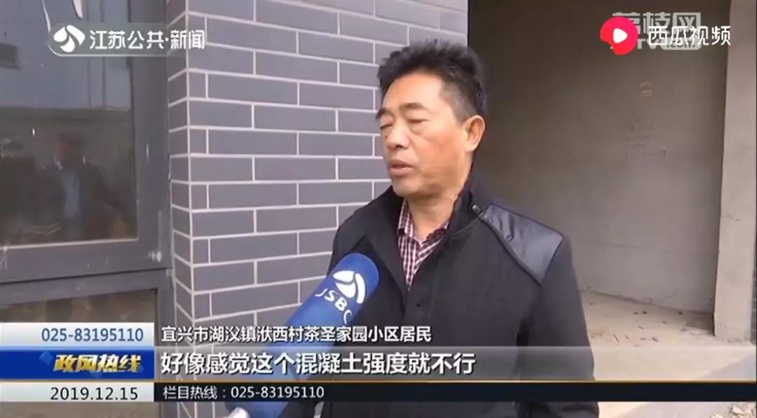 宜興市湖?鎮洑西村茶圣家園小區居民稱,下完雨以后,它會有積水,房頂上全是水印,混凝土顏色是黃色的,像黃泥巴的顏色。模板撤了以后,鋼筋全部露在外面,感覺這個混凝土強度不夠,用手掰混凝土,都是酥的,輕輕一捏就碎了。