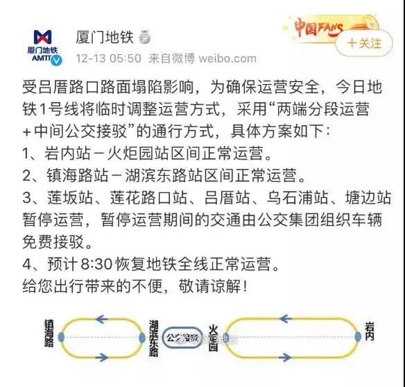12月13日5:50,@廈門地鐵 再次發布消息,受呂厝路口路面塌陷影響,廈門地鐵1號線臨時調整運營方式,蓮坂站、蓮花路口站、呂厝站、烏石浦站、塘邊站暫停運營,暫停運營期間的交通由公交集團組織車輛免費接駁。預計8:30恢復地鐵全線正常運營。